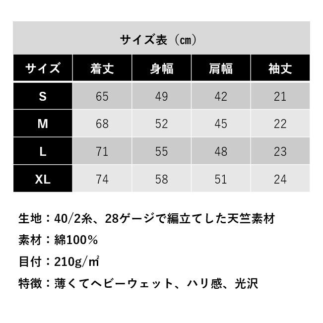 40/2の糸を使用し28ゲージで編立てした天竺素材です。通常40/2の糸を使用した天竺は22ゲージ、もしくは24ゲージで編まれることが一般的であって、28ゲージで編むのは非常に困難ですが、それによりハリ感が生まれ、さらにシルケット加工を施すことで光沢もある仕上がりになっています。